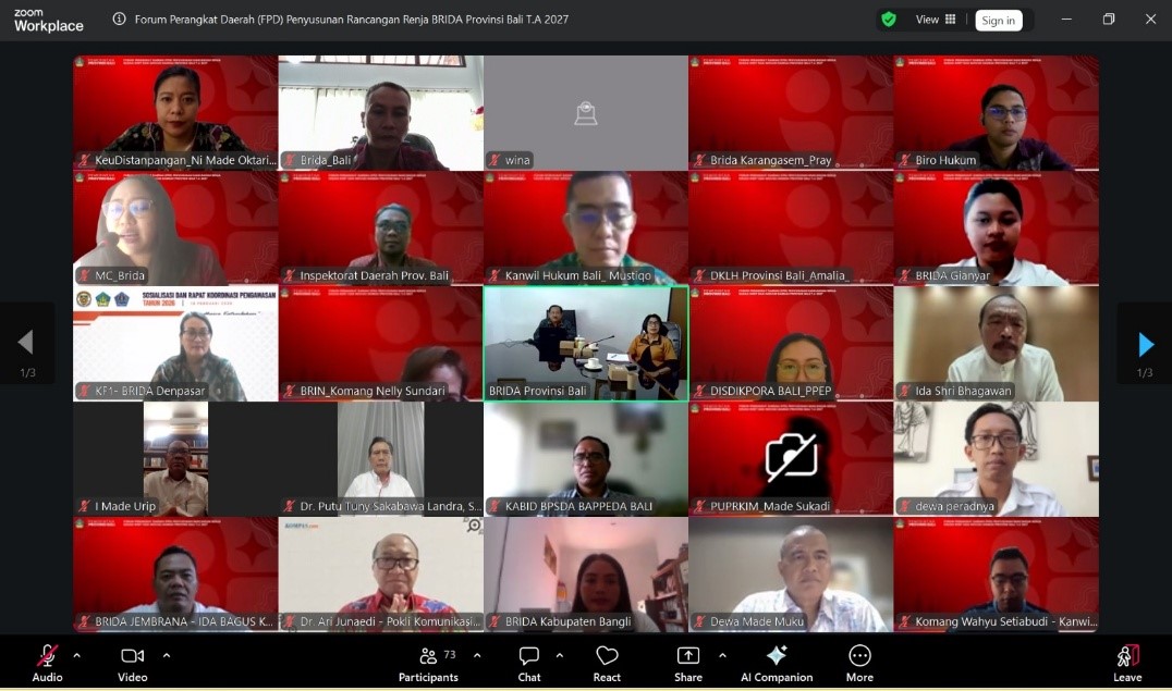 Hal itu disampaikan Kepala BRIDA Provinsi Bali Dr. Ketut Wica, S.Sos, MH saat membuka acara Forum Perangkat Daerah (FPD) Rancangan Renja BRIDA Provinsi Bali Tahun 2027 pada hari Jumat, 20 Februari 2026 yang dilaksanakan secara daring dan dihadiri oleh para stakeholder terkait dari unsur Perangkat Daerah di Lingkungan Pemerintah Provinsi Bali, BRIDA Kabupaten/Kota se-Bali, Kelompok Ahli Pembangunan Provinsi Bali, LPPM Perguruan Tinggi (Negeri/Swasta), Tim Pengendali Mutu, Inkubator Bisnis, dan Pejabat Administrasi serta Pejabat Fungsional di Lingkungan BRIDA Provinsi Bali.